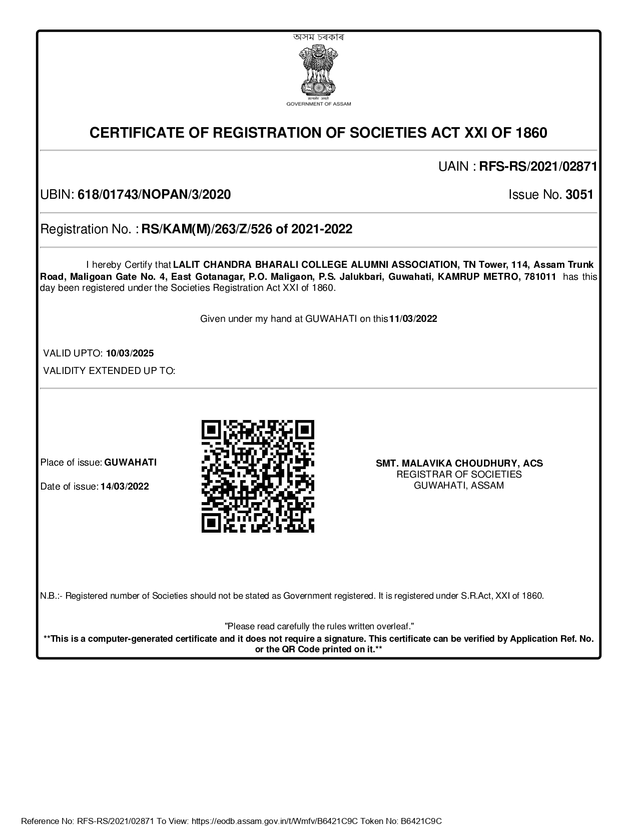 Lalit Chandra Bharali College has produced a long list of alumni who are spread all over the globe. Lalit Chandra Bharali College Alumni Association was established to maintain a lifelong interconnection between the college and the alumni. Registered under the Societies Registration Act XXI of 1860, the association has worked to serve the alumni and the alma mater.